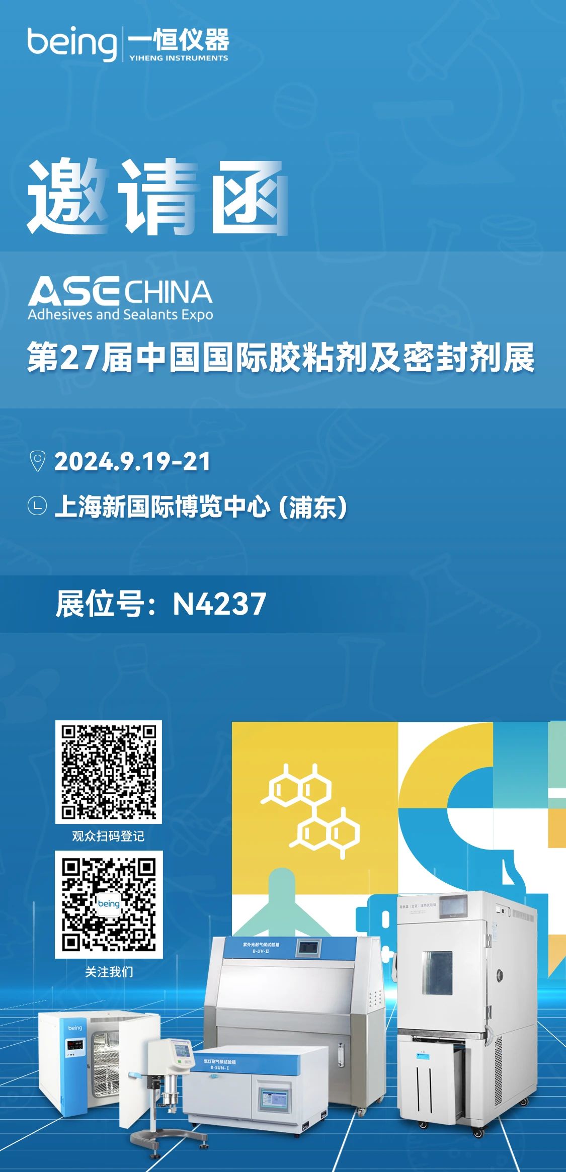 2024-09-13 | 文章來(lái)源: | 點(diǎn)擊率: 國(guó)際膠粘劑及密封劑展覽會(huì)(ASE CHINA)是以膠粘劑、密封劑、膠粘帶及薄膜為一體的專業(yè)展覽會(huì)已獲得UFI權(quán)威認(rèn)證。第27屆國(guó)際膠粘劑及密封劑展將于2024年9月19-21日在上海新國(guó)際博覽中心舉辦。本次展覽會(huì),我司將攜高低溫(交變)濕熱試驗(yàn)箱、氙燈耐氣候試驗(yàn)箱、紫外光耐氣候試驗(yàn)箱、鼓風(fēng)干燥箱、均質(zhì)分散機(jī)和新款粘度計(jì)等產(chǎn)品亮相N4237展臺(tái),期待您蒞臨現(xiàn)場(chǎng),交流合作。