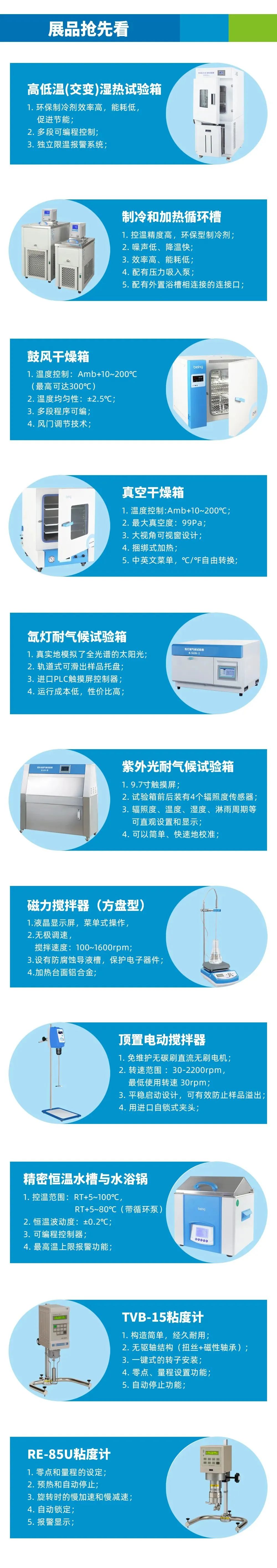 本次展會,我們將攜專業(yè)的粘度計、制冷和加熱循環(huán)槽、耐氣候試驗箱、高低溫(交變)濕熱試驗箱等實驗室儀器設(shè)備以及解決方案亮相W4231展位,期待您的蒞臨和交流!