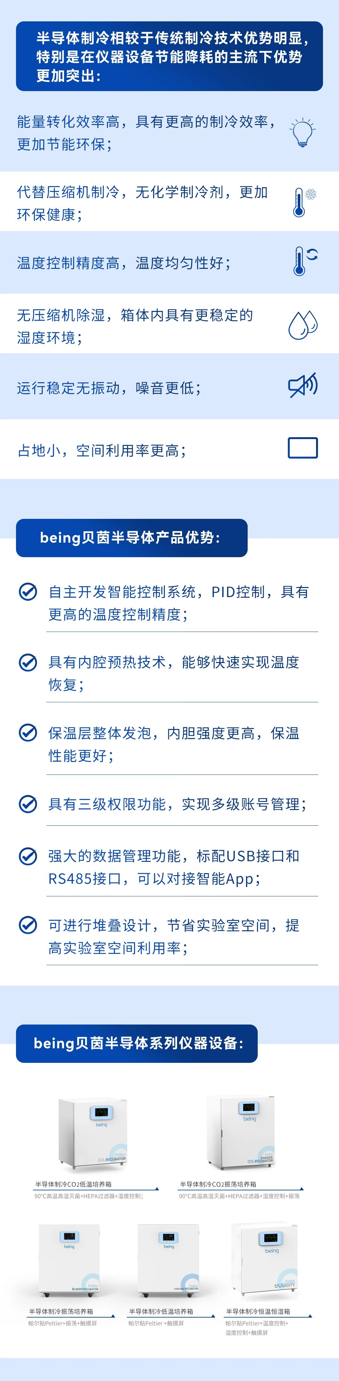 半導(dǎo)體制冷儀器設(shè)備利用帕爾貼制冷技術(shù),實(shí)現(xiàn)對培養(yǎng)箱的低溫控制、濕度控制、氣體濃度控制、光照控制等,同時具有加熱和制冷功能,是需要低溫環(huán)境的細(xì)胞、細(xì)菌、微生物培養(yǎng)以及樣品存儲、植物栽培、生物育種、分子生物學(xué)研究中理想的恒溫設(shè)備。