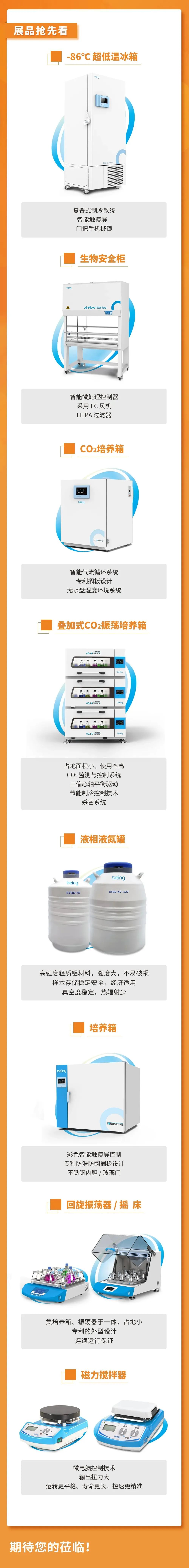 我們本次展會(huì)將攜-86℃超低溫冰箱、生物安全柜、二氧化碳培養(yǎng)箱、疊加式二氧化碳振蕩培養(yǎng)箱、液相液氮罐、搖床、磁力攪拌器等產(chǎn)品亮相于B018展臺(tái),期待您蒞臨現(xiàn)場(chǎng),交流合作。